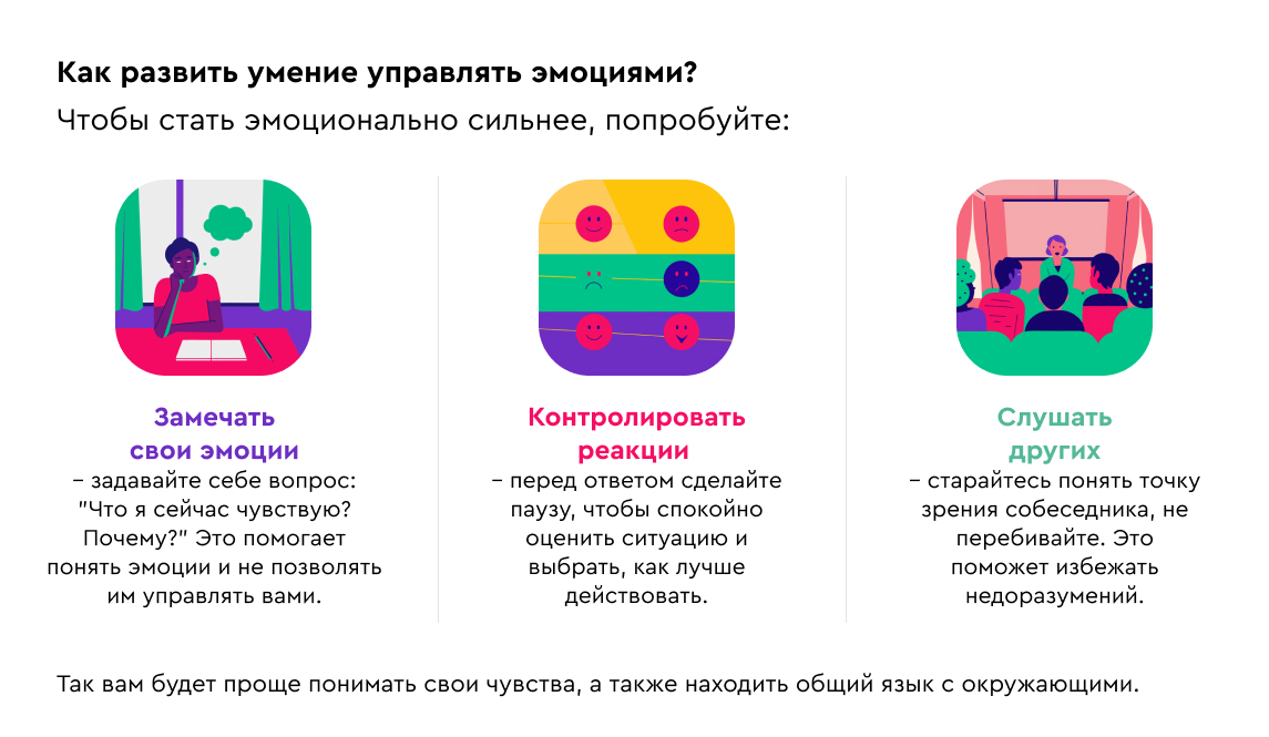 Управление эмоциями — это полезный навык, который помогает чувствовать себя увереннее, решать рабочие задачи спокойнее и избегать лишнего стресса. Начните с малого: обращайте внимание на свои эмоции, делайте паузы и больше слушайте окружающих.