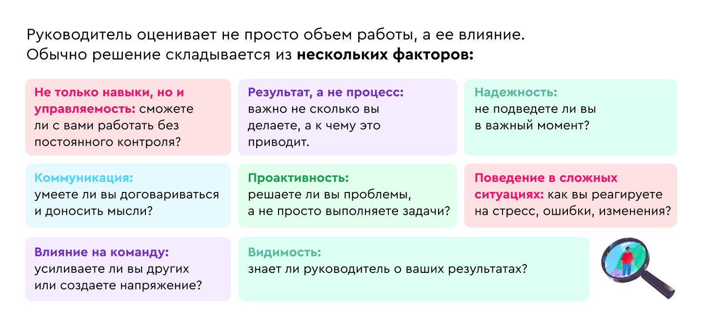 И здесь важный момент: повышают не только за прошлый опыт, но за готовность к следующей роли. Чаще всего тех, кто уже частично работает на уровень выше.