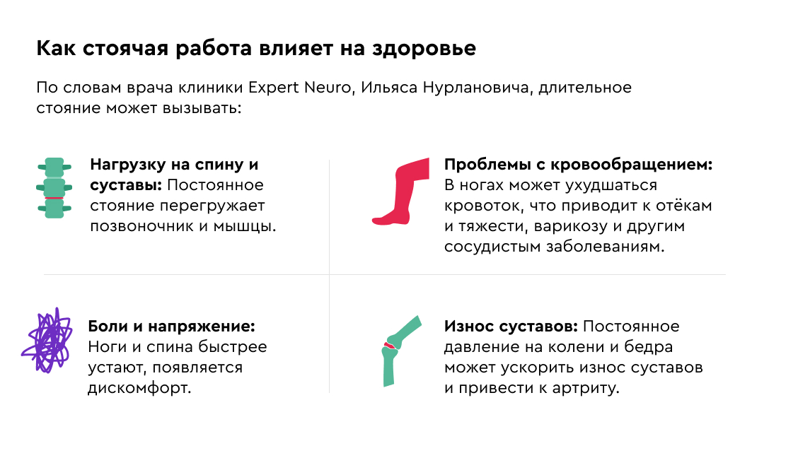 В этой статье мы расскажем, как заботиться о своем здоровье при стоячей работе: что помогает снизить дискомфорт, избежать неприятных последствий и поддерживать хорошее самочувствие даже при длительной нагрузке. Простые и эффективные рекомендации от специалистов нашего партнера - клиники Expert Neuro, сделают ваш рабочий день комфортнее и безопаснее для организма.