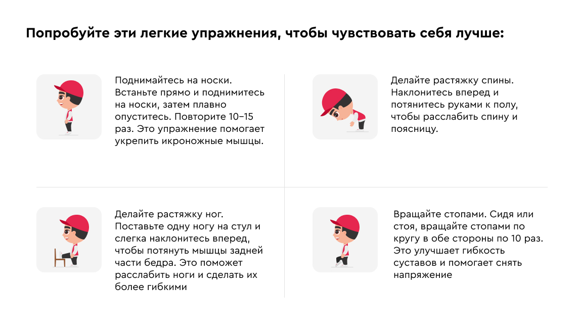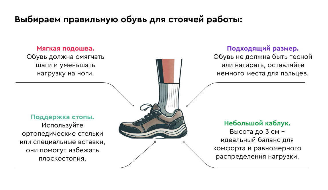 Здоровье — это главное, особенно если работа требует повышенной нагрузки. Правильная осанка, удобная обувь и регулярные перерывы помогут вам чувствовать себя комфортно и избежать серьезных проблем в будущем.