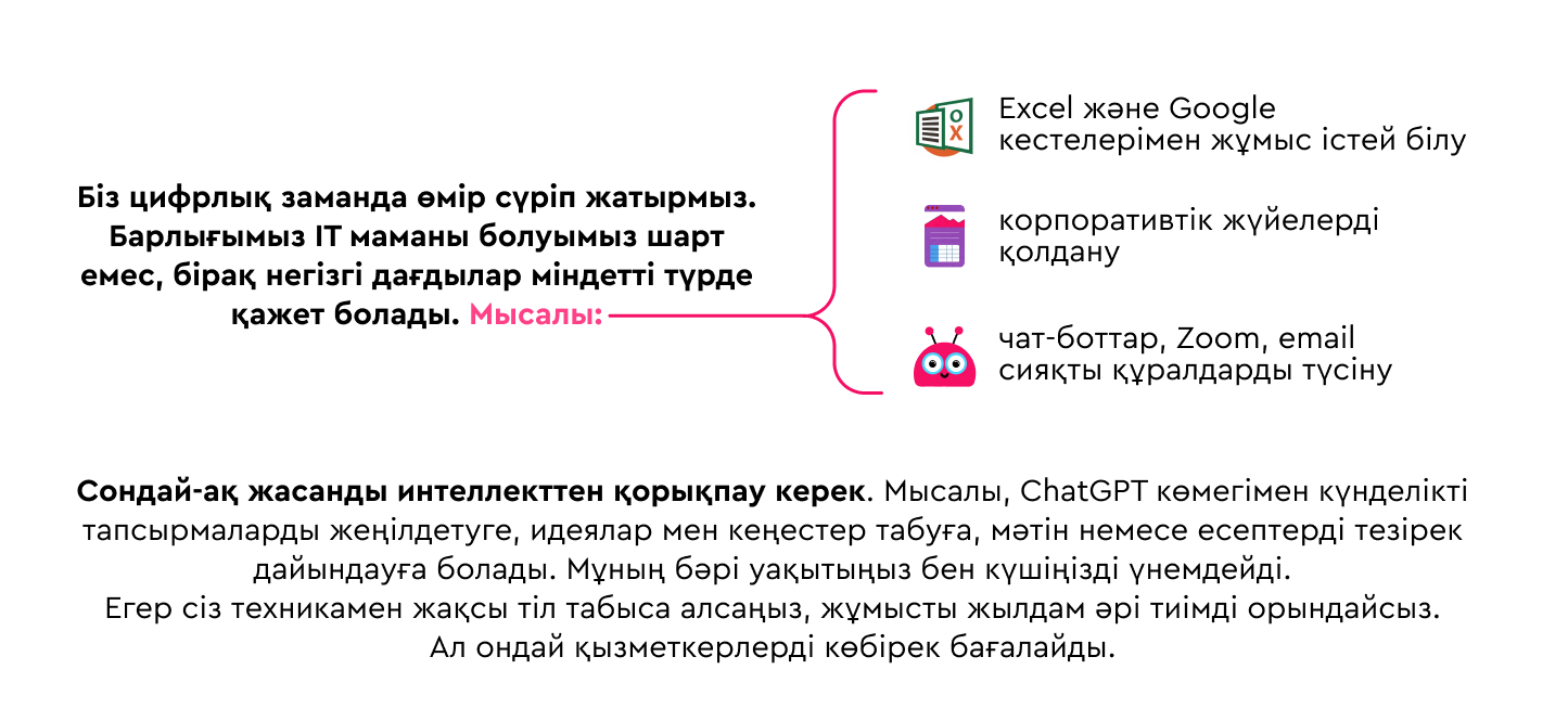 Жасанды интеллекттен қорықпау керек. Мысалы, ChatGPT көмегімен мәтін жазу, есеп дайындау, идея табу оңай. Бұл — уақыт пен күш үнемдейді. Техникамен “дос” болған адам — тиімді қызметкер. Ал мұндай қызметкерлерді бағалайды.