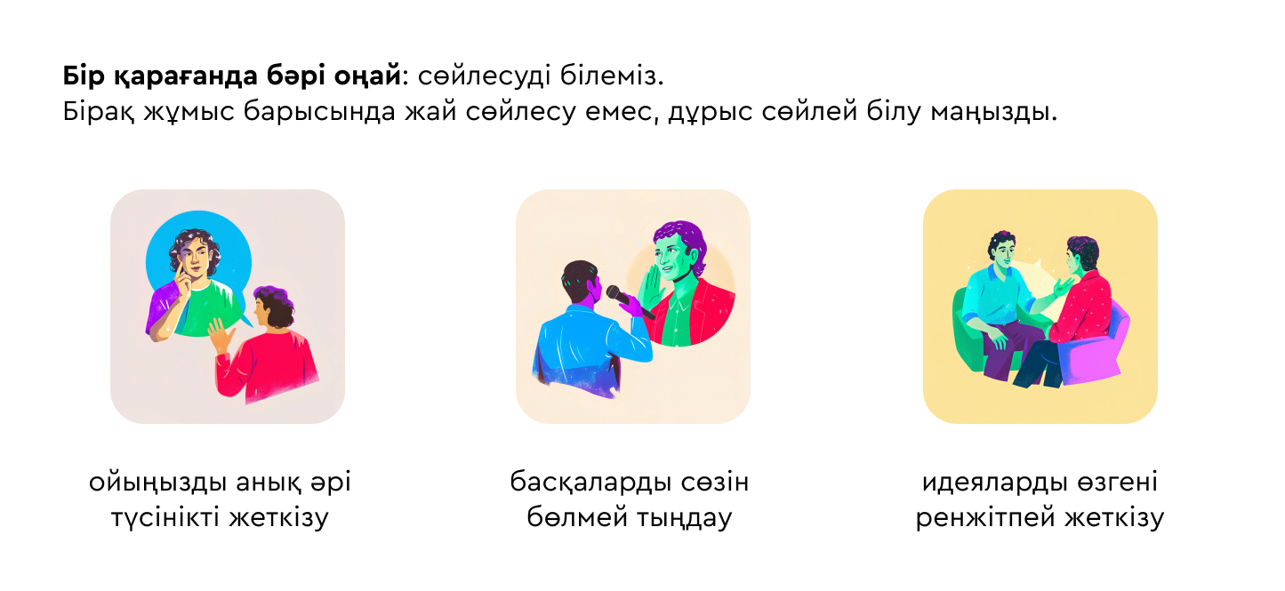 Мысал: сізге тапсырманы орындау үшін қосымша ақпарат қажет. Болжаудың орнына, бастыққа барып нақты сұрақтар қоясыз. Нәтижесінде — қателік аз, уақыт үнемделеді, ал сізге сенім арта бастайды. Жақсы сөйлесе алатын адамдар — болашақ басшылар мен келіссөз жүргізушілер. Ал олардың табысы жоғары.