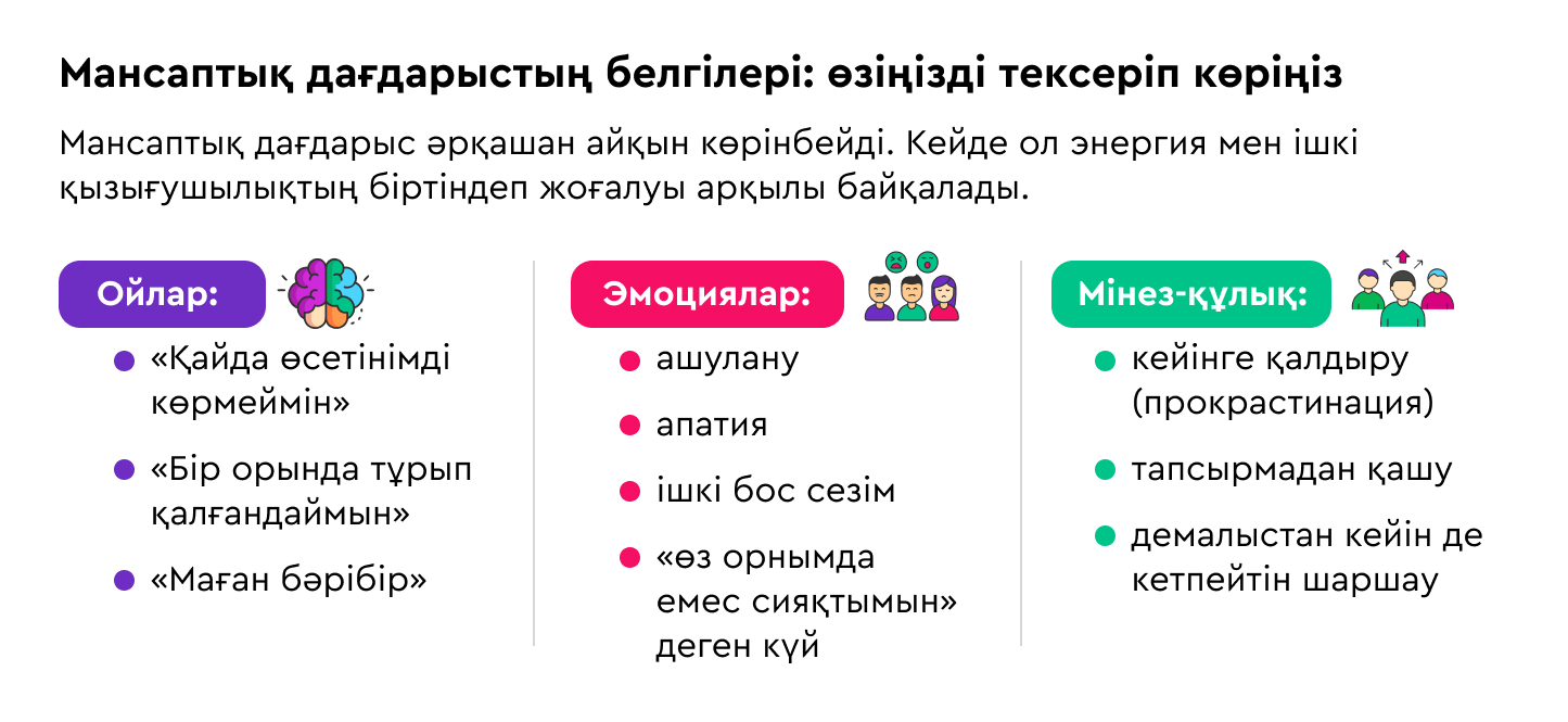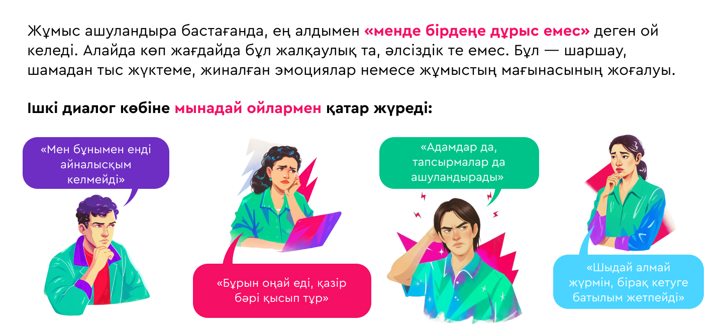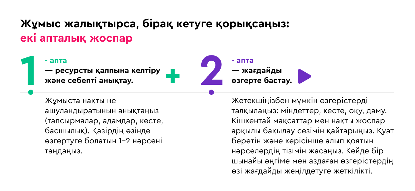 Кейде бәрі ұсақ-түйектен басталады: таңертең тұруға зауқың соқпайды, үйреншікті тапсырмалар ашуландырады, ал кешке қарай мүлде күш қалмағандай күй кешесіз. Бас айналасында бір ой қайта-қайта оралады: «Бұл жұмыс әбден жалықтырды, бірақ кетуге қорқамын».