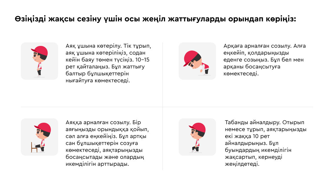 Тұрақты жаттығулар қан айналымын жақсартады, бұлшықеттердегі шаршау мен кернеуді кетіреді, денені икемді әрі тығыз етеді.