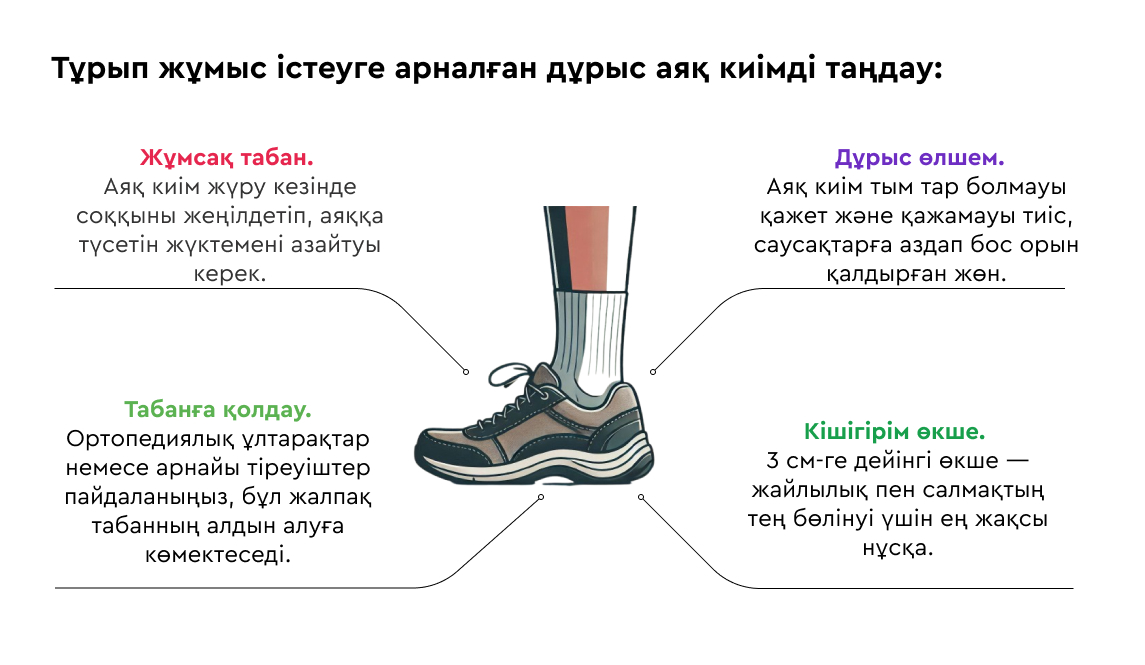 Егер сіз күні бойы аяғыңызда жұмыс істесеңіз, дұрыс қалып (осанка), жайлы аяқ киім және үзілістер денсаулықты сақтауға көмектеседі. Егер ауырсыну ұзақ уақыт өтпесе, дәрігерге қаралу маңызды. Magnum қызметкерлері үшін Expert Neuro клиникасынан арнайы ұсыныстар бар.