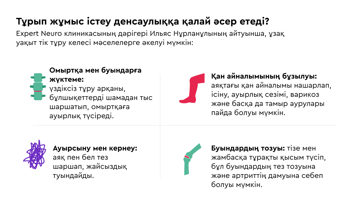 Бұл мақалада тұрып жұмыс істеу кезінде денсаулықты сақтаудың тиімді тәсілдерін қарастырамыз. Expert Neuro клиникасының мамандары ұсынған қарапайым, бірақ пайдалы кеңестер жұмыс күнін жайлы әрі қауіпсіз етуге көмектеседі.